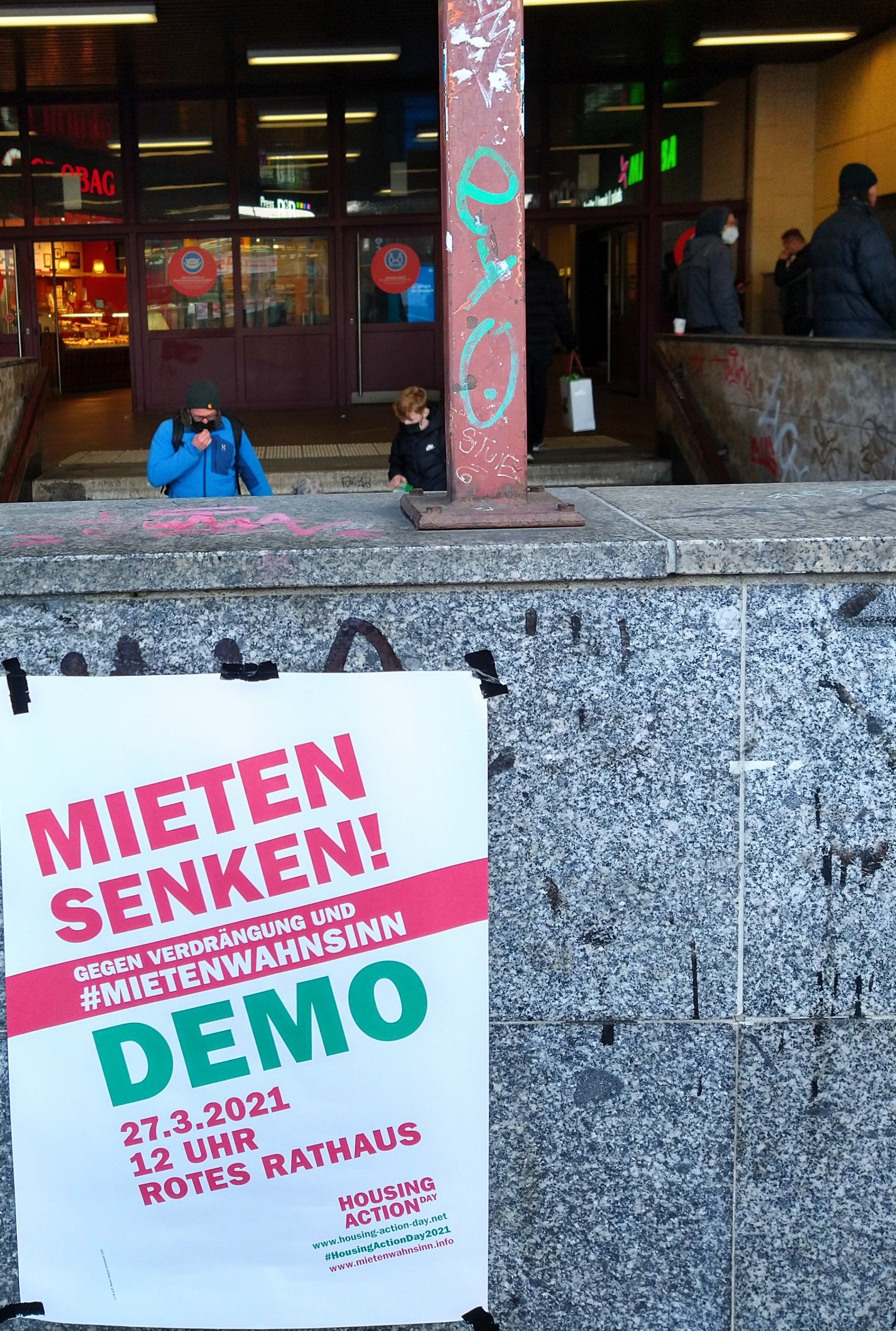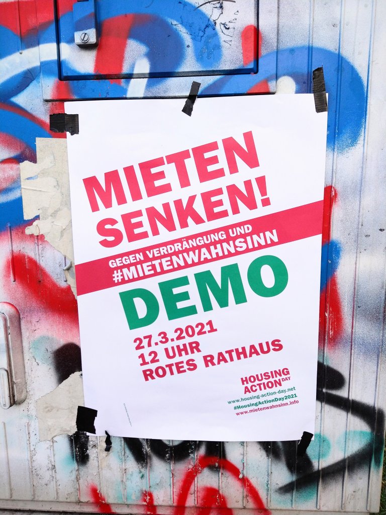 Das Bündnis ‚Gemeinsam gegen Verdrängung und #Mietenwahnsinn‘ in Berlin ruft zur Demonstration am 27.03.21 auf, am europaweiten Housing Action Day. An diesem Tag sollen — bisher — in 58 Städten Europas Kundgebungen und Demonstrationen für ein Recht auf Wohnen stattfinden. Der 27. März ist ein wichtiger Tag der Mobilisierung für die Bewegung in Frankreich, weil am 31.03. jedes Jahr die Winterpause für Zwangsräumungen endet.